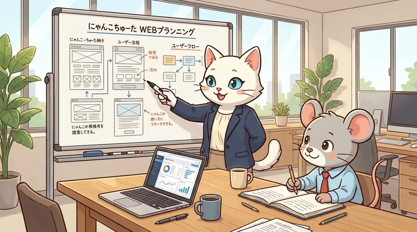 Webプランナーは、Webサイトやアプリケーションの立ち上げ・改善において、戦略立案と要件定義を行う職種です。クライアントのビジネスゴールを理解し、ターゲットユーザーの行動を分析した上で、最適なコンテンツ構成や機能を企画します。制作チーム(デザイナー・エンジニア)への橋渡し役も担い、プロジェクトを成功へ導く設計図を描くのが主な役割です。