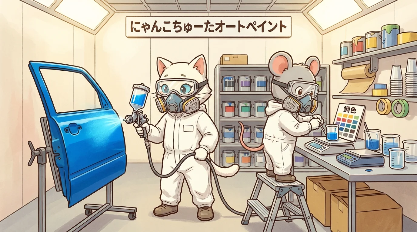 実際は地味な色(白・シルバー・黒)のファミリーカーの傷直しが9割。塗装よりも、何時間もかけて行うヤスリがけと、完璧な清掃が仕上がりを左右する。