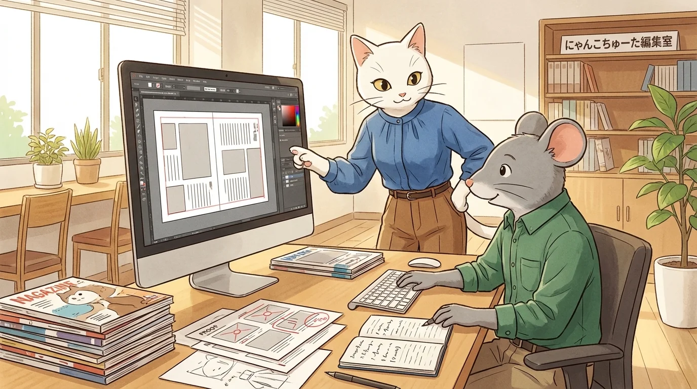 実際は、数ミリ単位のレイアウト調整、誤字脱字の修正対応、印刷会社との細かな調整など、職人的でストイックな作業が中心です。
