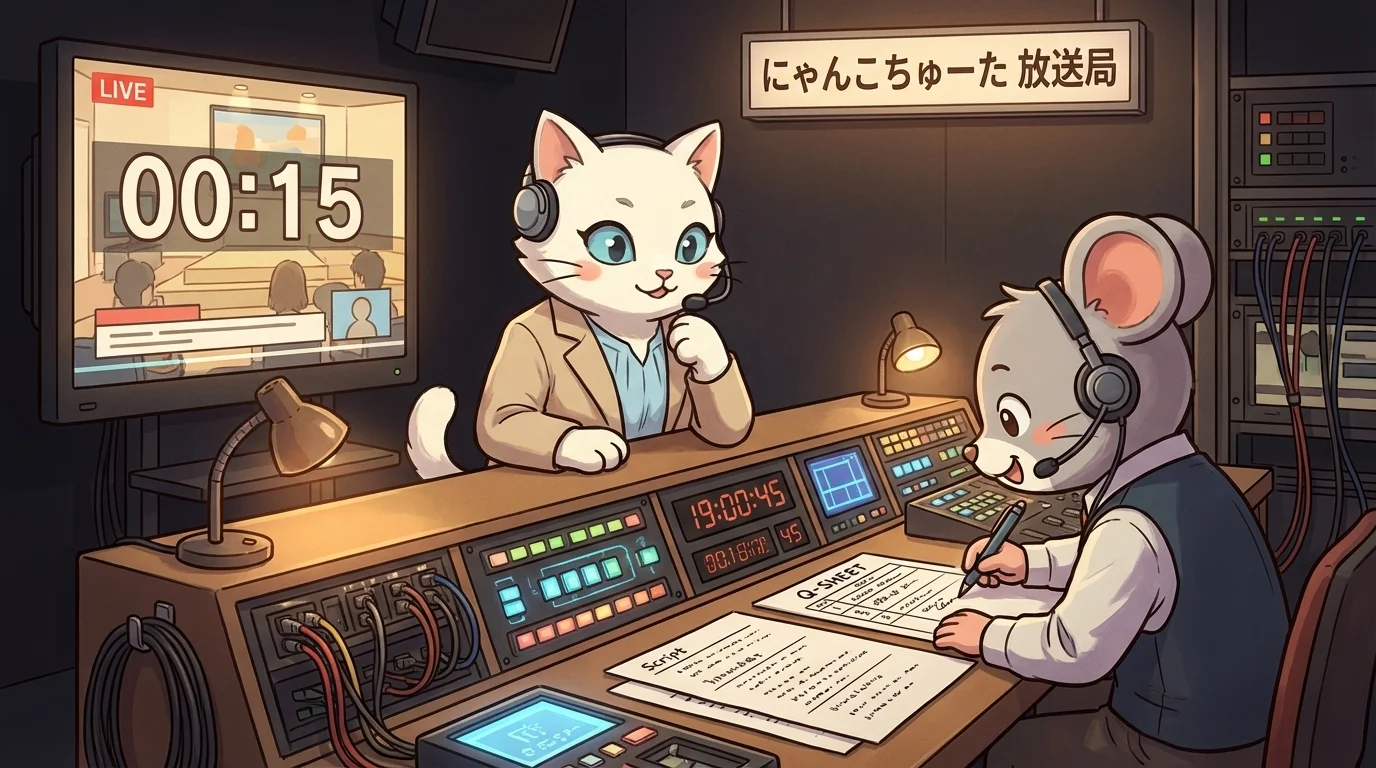 放送開始から終了まで、1秒のズレもなく進行を管理します。CM入りのタイミングやコーナーの尺をリアルタイムで計算し続けます。